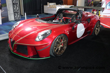 | The Revzone included a 2017 Alfa Romeo 4C Barchetta Spyder. The engine has been upgraded with forged connecting rods and pistons, port and polished cylinder heads, twin-scroll generation 2 Garrett GTX30 turbochargers, and methanol injection with 550cc injectors. The motor has a titanium exhaust down pipe. The chassis has been tuned with a three-way adjustable Nitron suspension. The wheels are forged Titan 7 rims. |