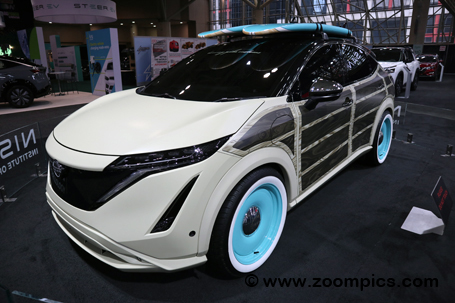 | Another concept vehicle located in the Nissan compound was the Nissan Ariya Surfwagon. The Ariya was designed to stroke dreams and inspire EV owners to personalize their vehicles to fit their lifecycles. The Surfwagon concept reimagines the 2023 Ariya, the company's first crossover, as a California-style surf 'woodie' wagon. The vehicle was created by South Carolina-based Tommy Pike Customs for Nissan. |