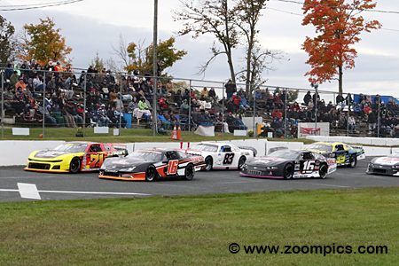 The pace lap for the Electric City 167, and as expected, the front row is occupied by Peterborough Speedway regulars.