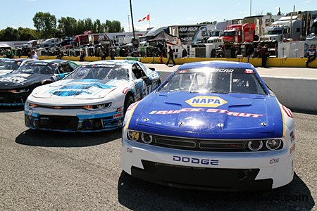 Sixteen competitors line up on Delaware Speedway's front straight for the penultimate round of the NASCAR Canada Series.