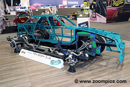 The front and rear track widths are compatible with 5-lug Fox Body aftermarket wheels.