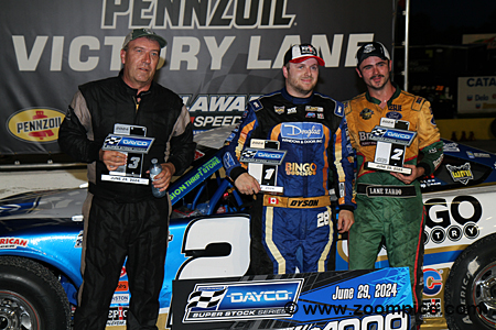 The top three finishers of the Dayco Super Stock 50 at Delaware Speedway.