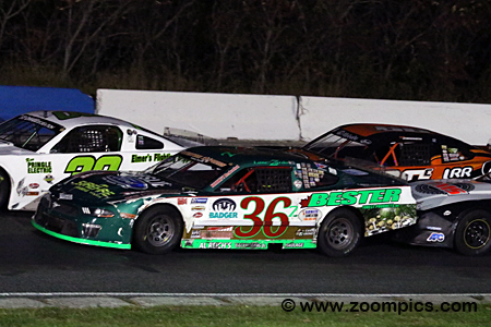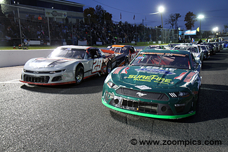 The Super Stock category includes a variety of North American makes and models from the ‘60s to the current year. The rules used in the class allow some suspension modifications and changes to the bodies. Some Super Stock cars retain the original steel bodies with plastic noses and fiberglass hoods; however, most use fiberglass panels. They are powered by a modified small-block engine or crate motor from General Motors and Ford. The cars weigh approximately 3,000 lbs, with 55% of the weight distributed to the left side. The division serves as a ‘stepping stone’ for those drivers who aspire to compete in the Pro Late Model category. The starting grid for the feature was set after two heat races. Drivers would compete in a fifty-lap contest around ‘Canada’s Toughest 1/3 Mile.’ Due to the multiple caution periods and a time limit, the race was checkered on lap 46.