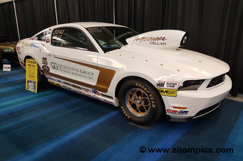 The Performance Pavilion also included drag cars. This 2010 Ford Mustang competes in the (NHRA) National Hot Rod Association s SS/CS class. It was built from a Ford Engineering car by Smith Performance Chassis. The Mustang is powered by a 306 cubic inch normally aspirated engine. The base model is powered by a 210-horsepower cast-iron block 4.0-liter SOHC V6, while the GT uses an aluminum block 4.6-liter SOHC three- valve Modular V8 with variable camshaft timing (VCT). Bolted to the motor is a Pro 350 transmission. The owner / driver, Vince Perno, is a five Super Stock record holder with the NHRA. The current record is 9.23 seconds at 142.59 miles per hour. |