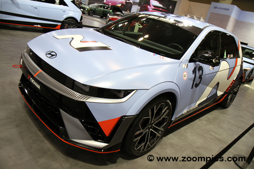 The No. 13 Hyundai Ioniq 5 N race car was entered by Bryan Herta Autosport and driven by Ron Zaras at the 2024 Pikes Peak International Hill Climb. The Hyundai will travel from 0 to 60 mph in 3.25 seconds with N Launch Control and the Grin Boost function utilized. The Ioniq 5 N has a top speed of 162 mph, which is accomplished with a 223 horsepower front motor and 378 horsepower rear motor for a total output of 601 horsepower. Battery capacity is 84kWh. Stopping the vehicle are four-piston calipers on the front with 15.75-inch rotors and 14.2-inch rotors on the rear with one-piston calipers. |