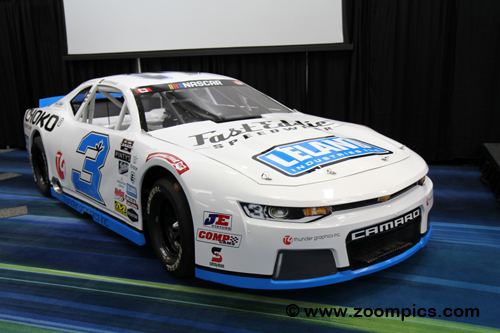 | On display were three cars from the NASCAR Canada Series - the Dodge Challengers of DJ Kennington and Larry Jackson. In the Performance Pavilion was the No. 3 Fast Eddie Speedware / Leland Industries Chevrolet Camaro driven by Jason Hathaway. Hathaway, who began competing in the series' first year, won the championship in 2000. Series cars are constructed according to specifications and rules standards of most stock car series. The carbureted eight-cylinder motors produce approximately 550 horsepower. Depending on the gearing, these cars are estimated to have a top speed of 160 mph. |
