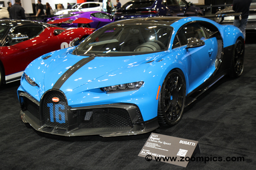 Grand Touring Automobiles brought an extensive collection of exotic vehicles to the AutoShow, including this 2021 Bugatti Pur Sport. The car on display is one of only sixty produced. The Bugatti was crafted in Molsheim, France. It is finished in Agile blue paint with gray carbon accents. The interior is finished in a black Alcantara. The car is equipped with an 8.0-liter quad-turbocharged W16 engine that produces 1,479 horsepower. The Pur Sport has a top speed of 489 km/h. The Bugatti can be purchased for $4,799 million (USD). |