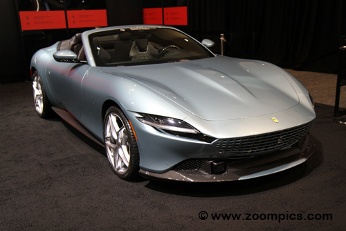 | Another Ferrari at the show was the Roma Spider. The Roma Spider is the replacement for the Ferrari Portofino. The Spider marks the return of a soft top for a front-engine Ferrari. The 1969 365 GTS4 is the last time a Ferrari used configuration. The Roma is powered by the Ferrari type F154 engine. It is a 3.9-liter turbocharged, 90-degree V-8, dual overhead camshaft design. The Roma's motor is rated at 612 horsepower between 5,750 and 7,500 rpm and 561 lb.-ft. of torque between 3,000 and 5,750 rpm. Some of the Ferrari's power comes from a forced induction air intake system that uses twin parallel water-cooled turbochargers and two air-to-air intercoolers.The Roma Spider has a top speed of over 199 mph. |
