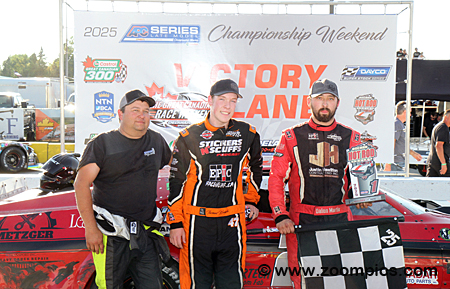 The top three finishers for round eight of the 2025 OSCAAR Hot Rod series at Delaware Speedway.