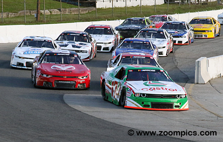 Fourteen NASCAR Canada drivers head into corner one at Delaware Speedway for the APC 125.