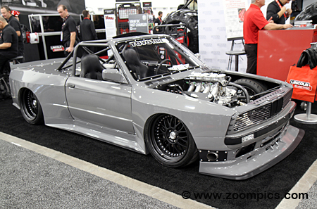 Exterior modifications include front and rear bumpers that are shaved and tucked, and the hood features a built-in air intake and a shaved cowl.