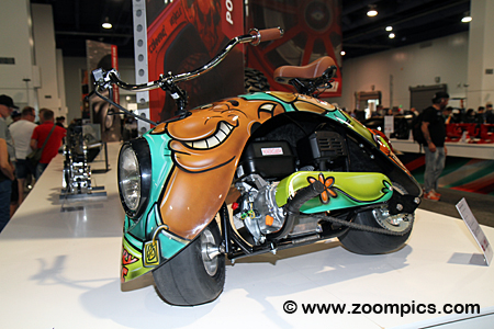 The steel body sits on a custom frame. The helmet is made of fiberglass and finished with silver metal flake paint.