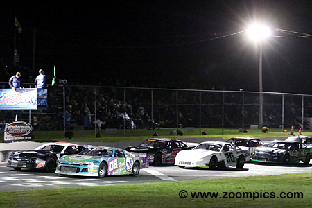 Seventeen Super Stock competitors line up on Peterborough Speedway’s front straight for the pace lap during the Autumn Colours Classic presented by B&G Towing and Recovery.