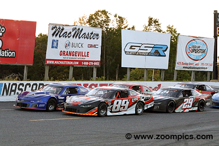 The pace lap at Sunset Speedway for the seventy-lap Stewart’s Stampede 70. On the pole is the No. 89C London Recreation Racing / Stewart’s Chevrolet Camaro driven by Shawn Chenoweth.