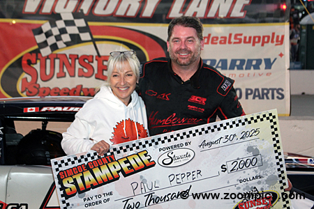 Paul Pepper receives the $2,000 cheque from Sunset Speedway’s co-owner, Sandra Todish, for winning the Stewart’s Stampede 70.