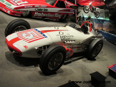 Another car mounted on the ‘high bank’ display is a replica of the 1959 Indianapolis 500 winning race car driven by Rodger Ward.