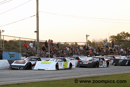 On the pole is the No. 51 Simcoe Barge & Break Wall sponsored Outlaw Super Late Model of Ethan Courneyea.