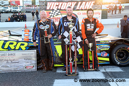 The top three finishers for round eight of the 2025 Ontario Outlaw Super Late Model series at Sunset Speedway's 'The Last Dance.'